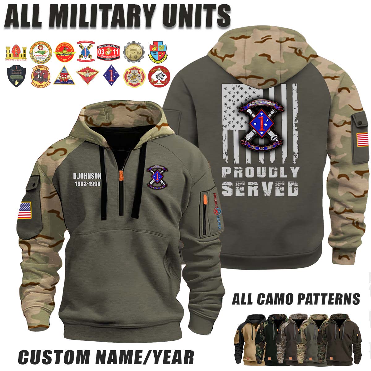 This 1-11 Marines 1st Battalion 11th Marines_Camo Halfzip Hoodie lets you customize your Branch, Unit, Role, Rank, and Years Served — so your service, sacrifice, and pride live on.