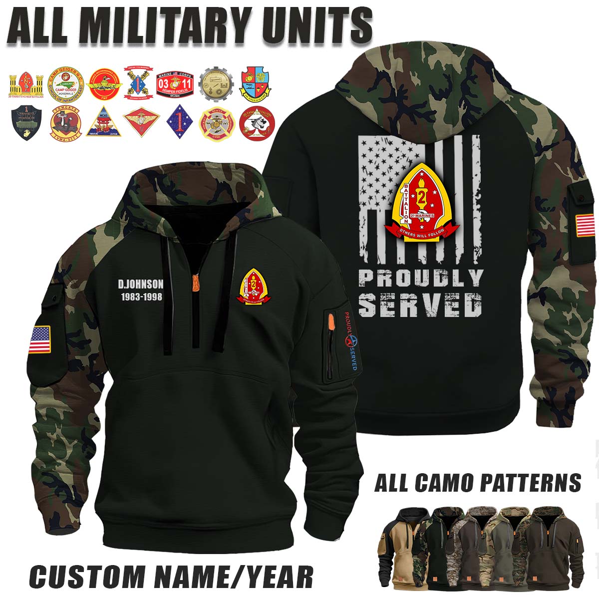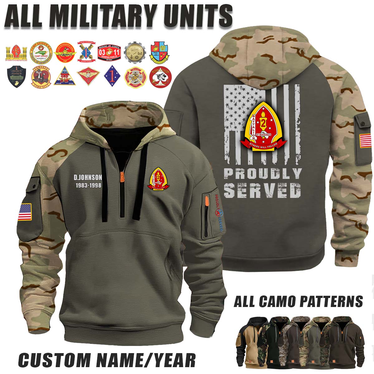 This 1-2 Marines 1st Battalion 2nd Marines_Camo Halfzip Hoodie lets you customize your Branch, Unit, Role, Rank, and Years Served — so your service, sacrifice, and pride live on.