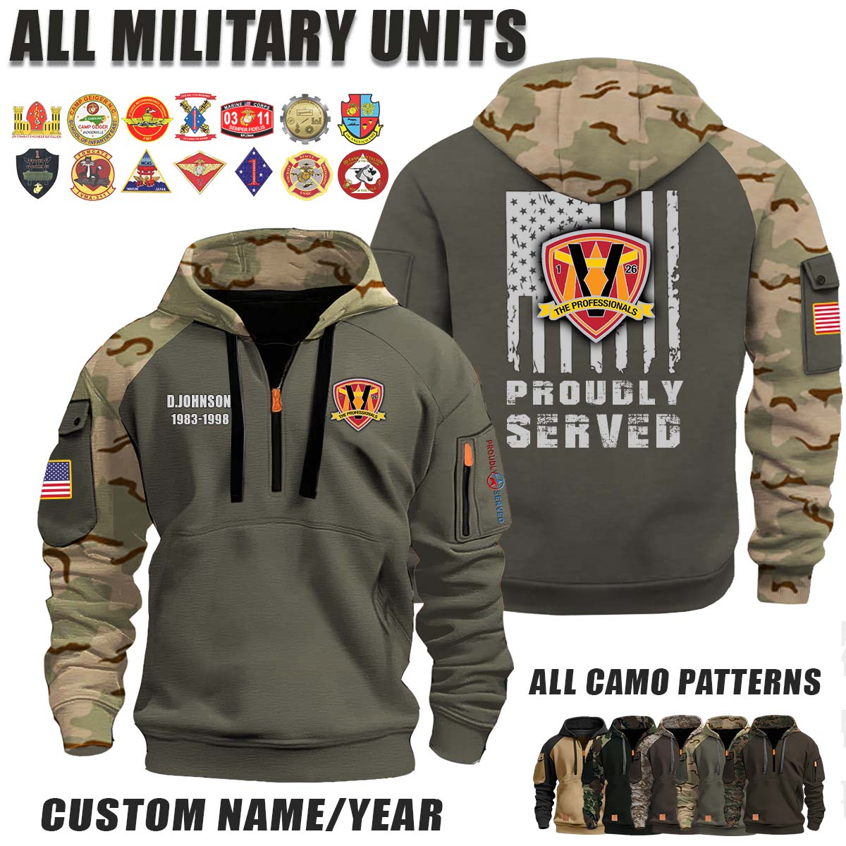 This 1-26 Marines 1st Battalion 26th Marines_Camo Halfzip Hoodie lets you customize your Branch, Unit, Role, Rank, and Years Served — so your service, sacrifice, and pride live on.