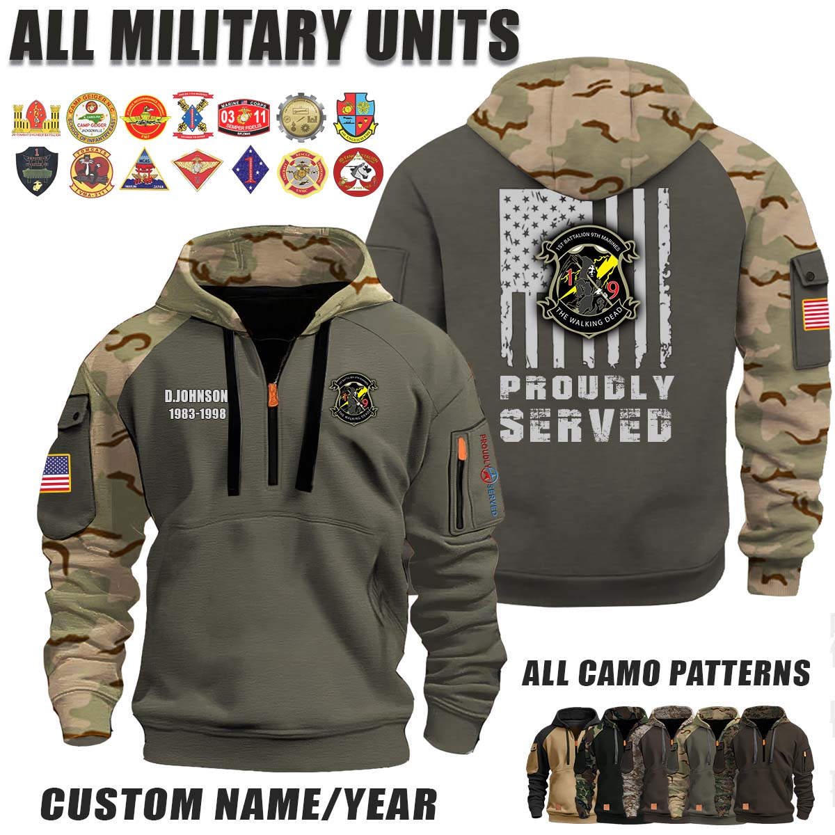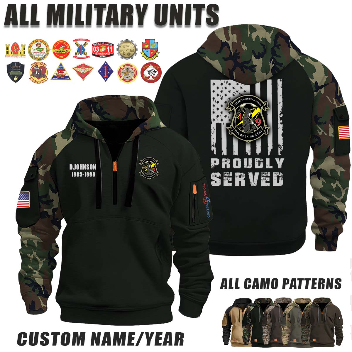 This 1-9 Marines 1st Battalion 9th Marines_Camo Halfzip Hoodie lets you customize your Branch, Unit, Role, Rank, and Years Served — so your service, sacrifice, and pride live on.