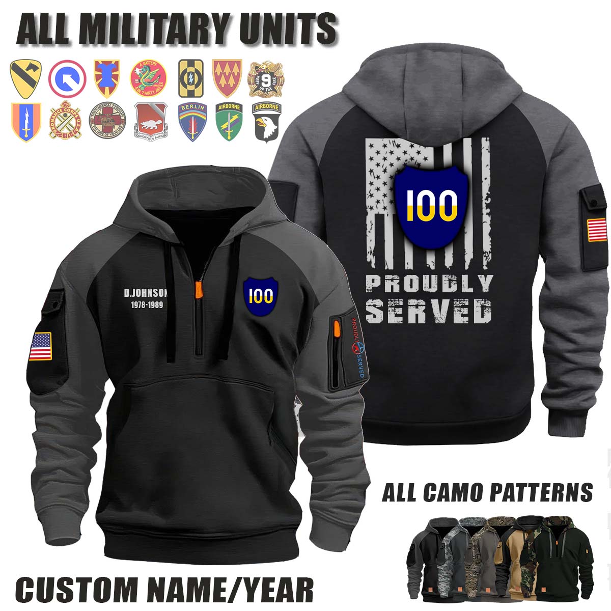 This 100th ID 100th Infantry Division_Camo Halfzip Hoodie lets you customize your Branch, Unit, Role, Rank, and Years Served — so your service, sacrifice, and pride live on.
