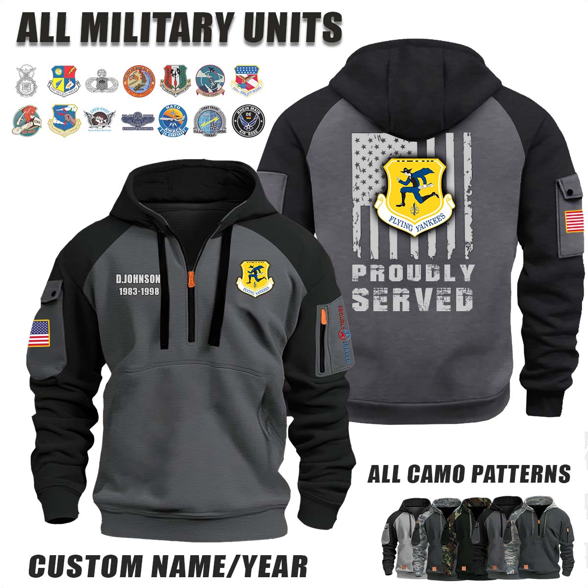 This 103rd AW 103rd Airlift Wing, ANG_Camo Halfzip Hoodie lets you customize your Branch, Unit, Role, Rank, and Years Served — so your service, sacrifice, and pride live on.