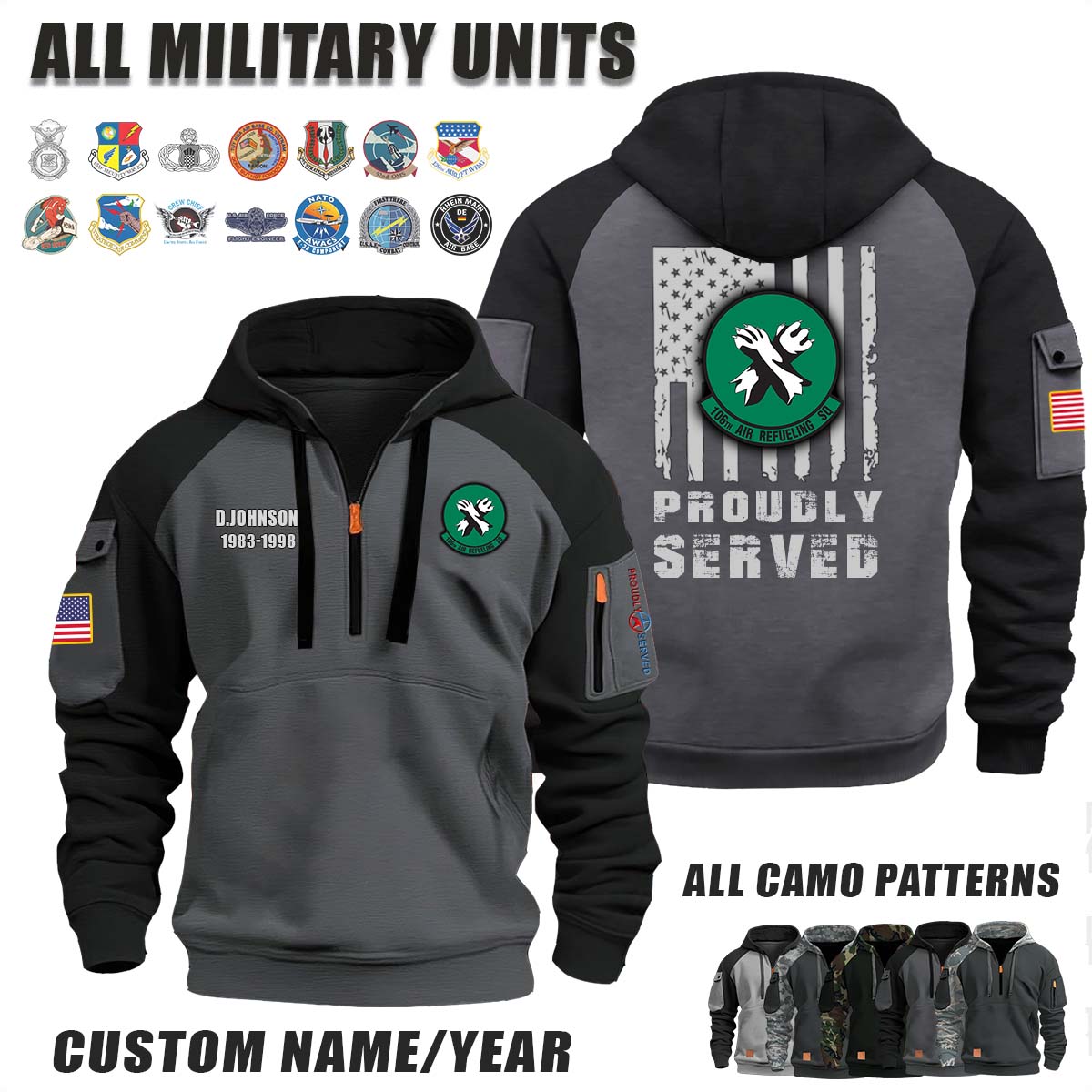 This 106th ARS Air Refueling Squadron_Camo Halfzip Hoodie lets you customize your Branch, Unit, Role, Rank, and Years Served — so your service, sacrifice, and pride live on.