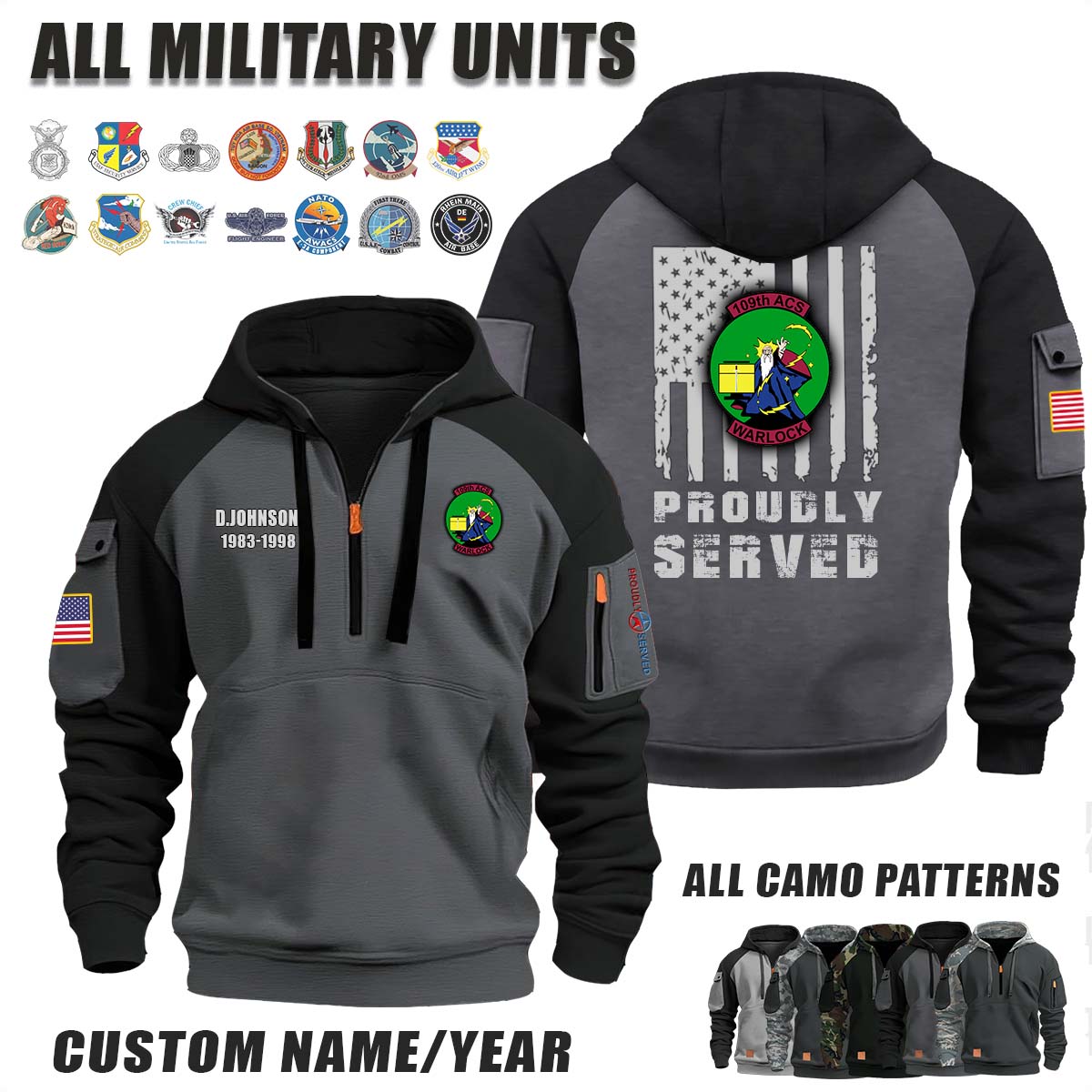 This 109th ACS Air Control Squadron_Camo Halfzip Hoodie lets you customize your Branch, Unit, Role, Rank, and Years Served — so your service, sacrifice, and pride live on.