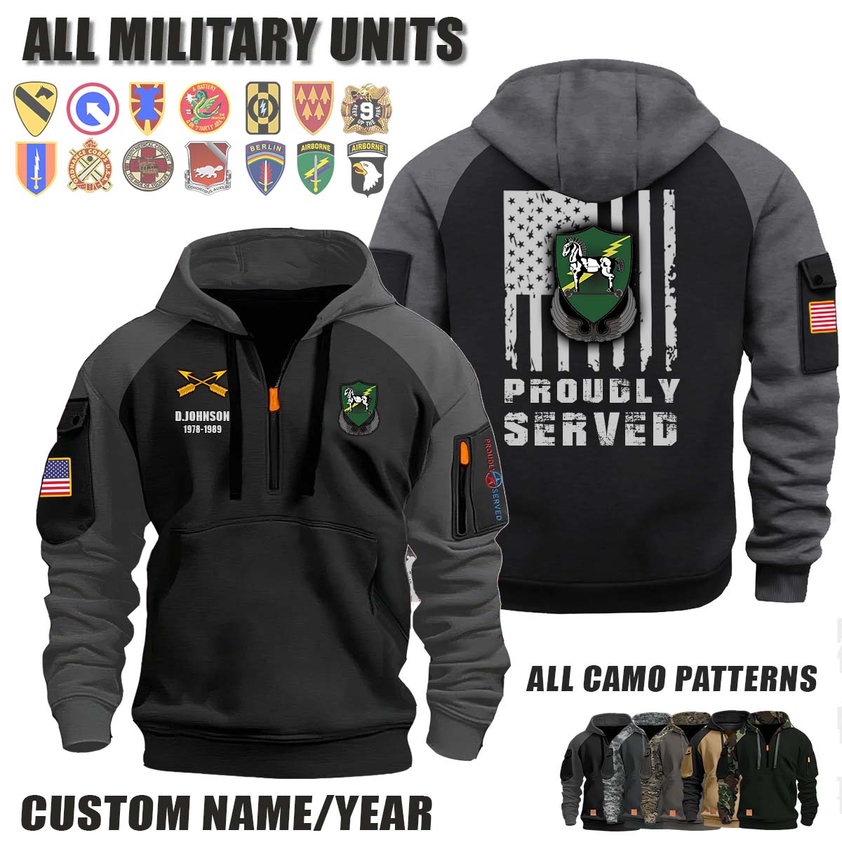 This 10th SFG (A) 10th Special Forces Group (Airborne)_ver2_Camo Halfzip Hoodie lets you customize your Branch, Unit, Role, Rank, and Years Served — so your service, sacrifice, and pride live on.