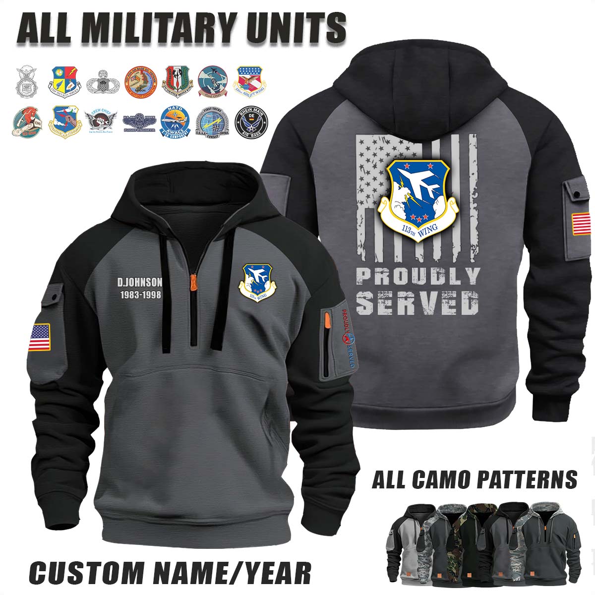 This 113th Wing_Camo Halfzip Hoodie lets you customize your Branch, Unit, Role, Rank, and Years Served — so your service, sacrifice, and pride live on.