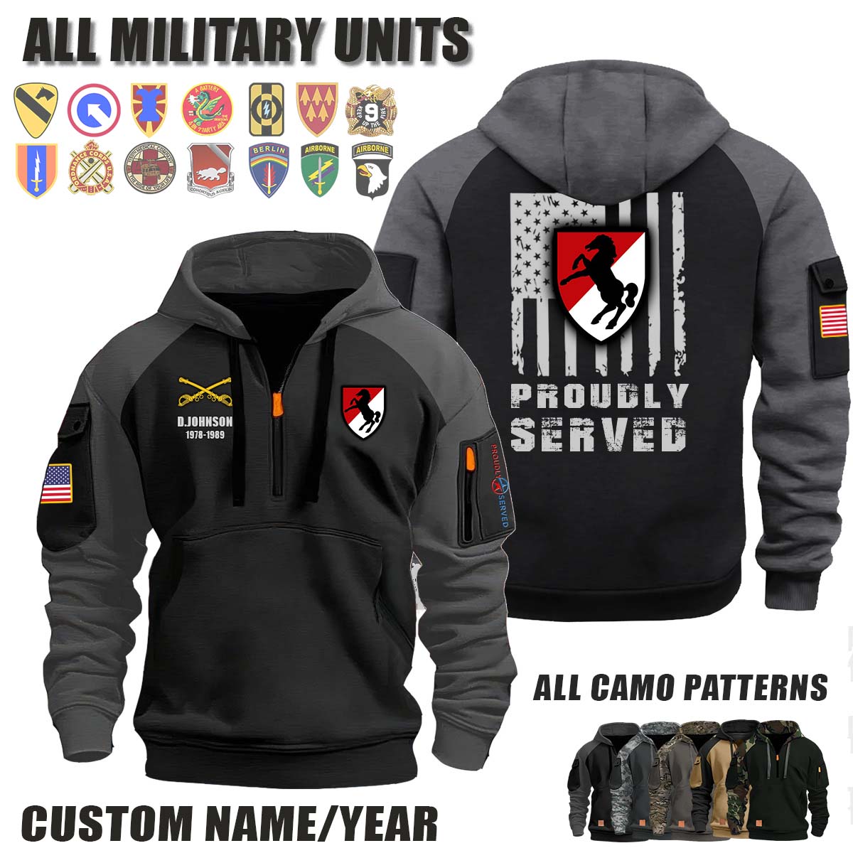 This 11th ACR 11th Armored Cavalry Regiment_Camo Halfzip Hoodie lets you customize your Branch, Unit, Role, Rank, and Years Served — so your service, sacrifice, and pride live on.