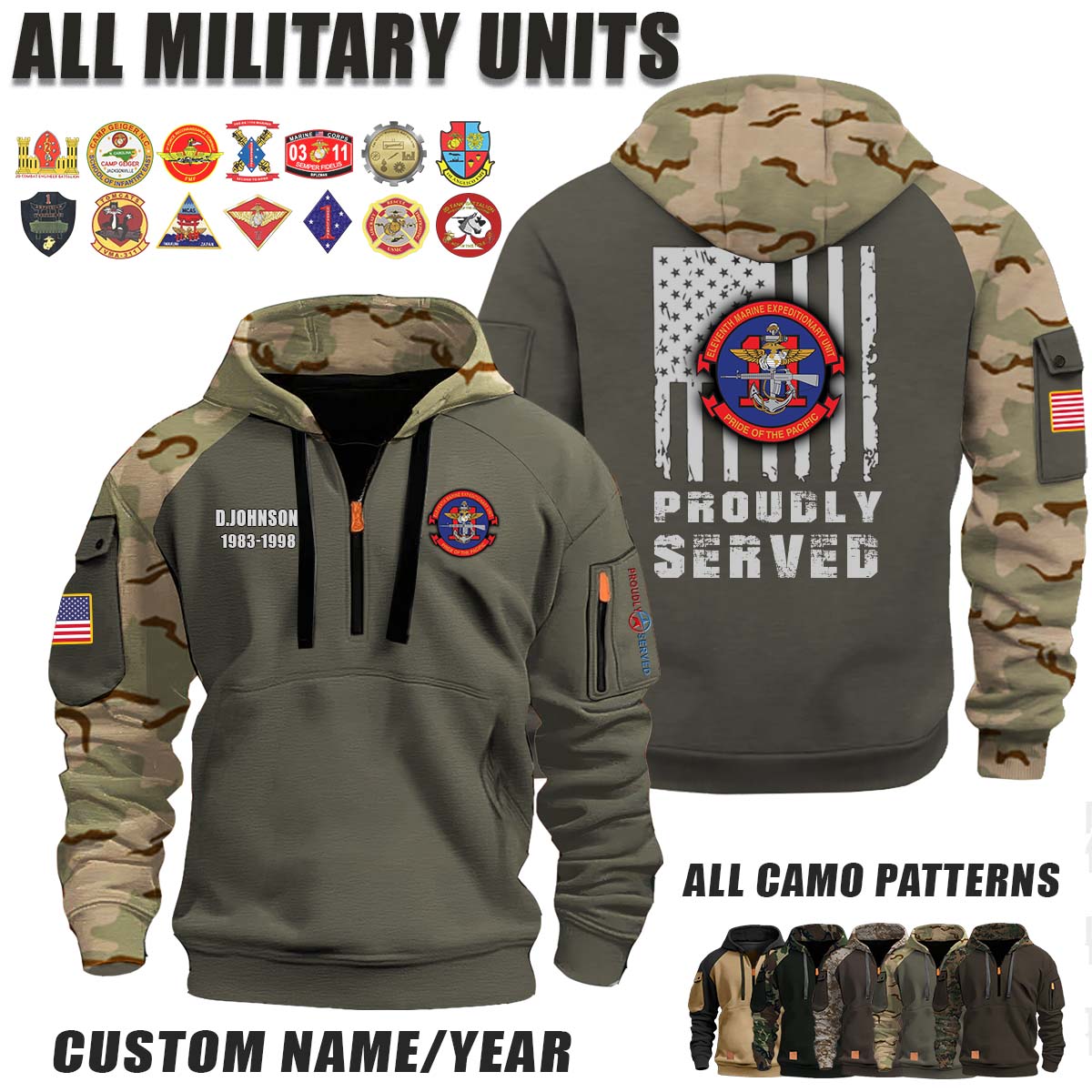 This 11th MEU 11th Marine Expeditionary Unit_Camo Halfzip Hoodie lets you customize your Branch, Unit, Role, Rank, and Years Served — so your service, sacrifice, and pride live on.