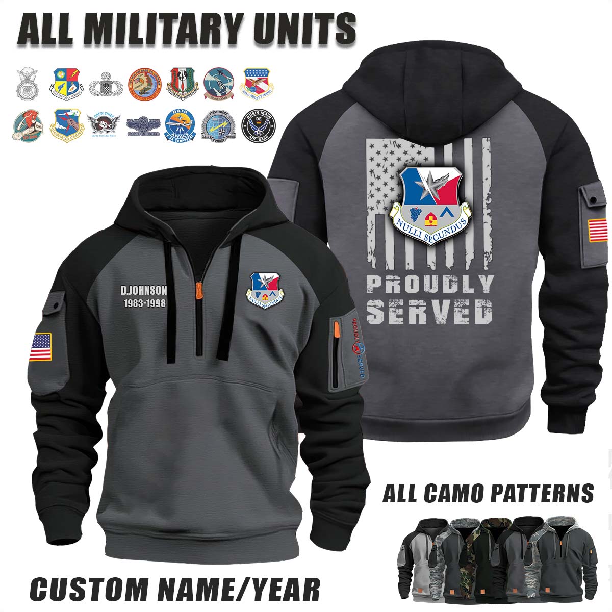 This 136th AW 136th Airlift Wing, ANG_Camo Halfzip Hoodie lets you customize your Branch, Unit, Role, Rank, and Years Served — so your service, sacrifice, and pride live on.