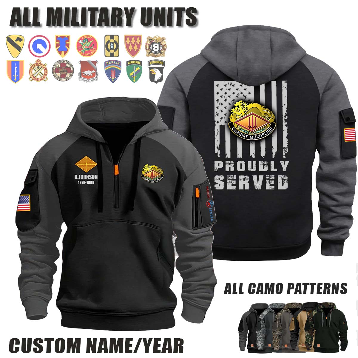 This 13th Finance Group V2_Camo Halfzip Hoodie lets you customize your Branch, Unit, Role, Rank, and Years Served — so your service, sacrifice, and pride live on.