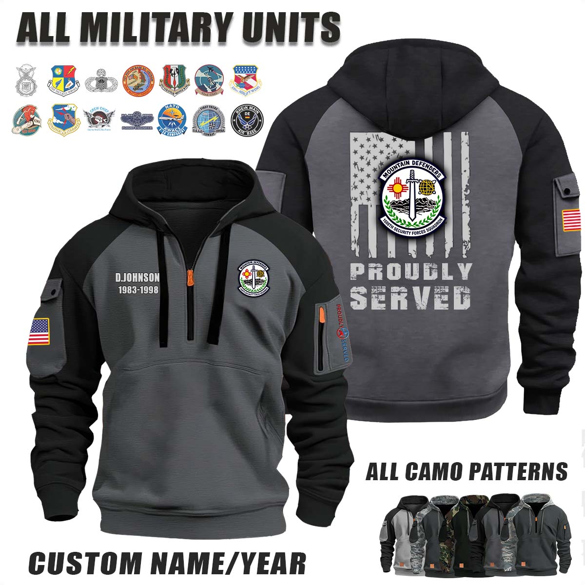 This 1608th SFS Security Forces Squadron_Camo Halfzip Hoodie lets you customize your Branch, Unit, Role, Rank, and Years Served — so your service, sacrifice, and pride live on.