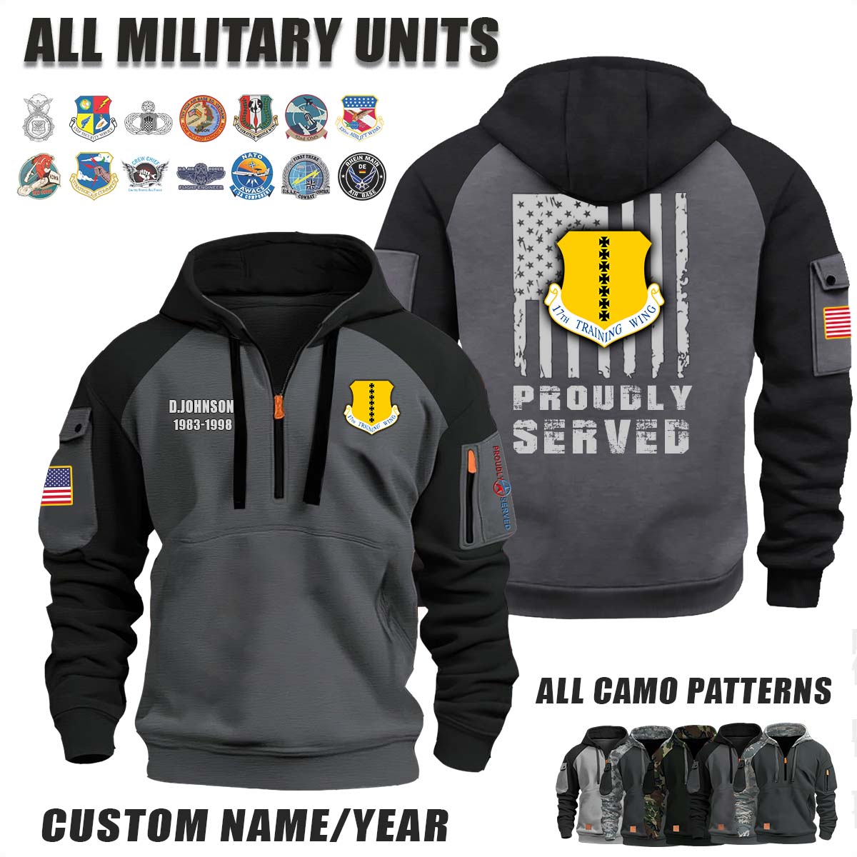 This 17th TRW Training Wing_Camo Halfzip Hoodie lets you customize your Branch, Unit, Role, Rank, and Years Served — so your service, sacrifice, and pride live on.