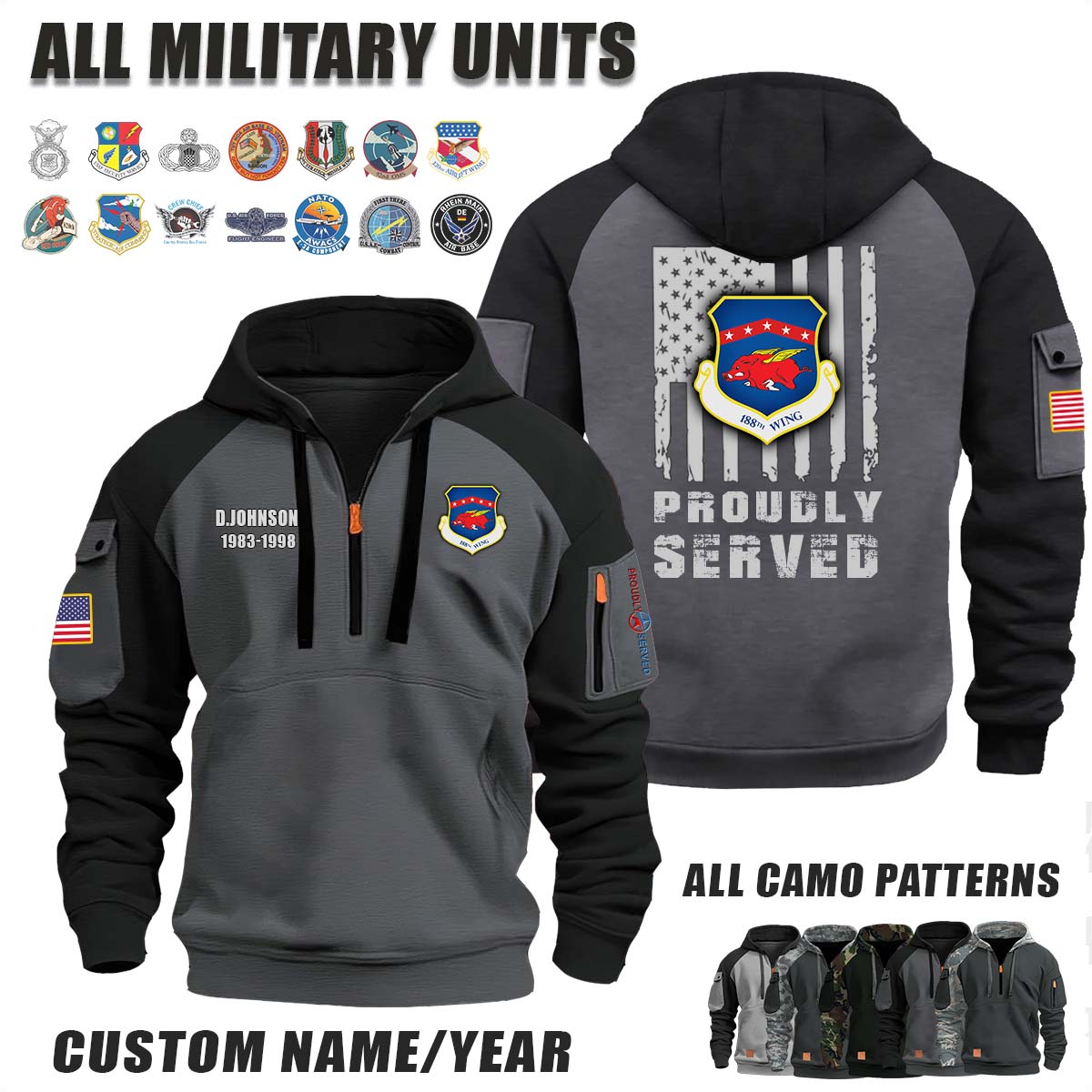 This 188th Wing_Camo Halfzip Hoodie lets you customize your Branch, Unit, Role, Rank, and Years Served — so your service, sacrifice, and pride live on.