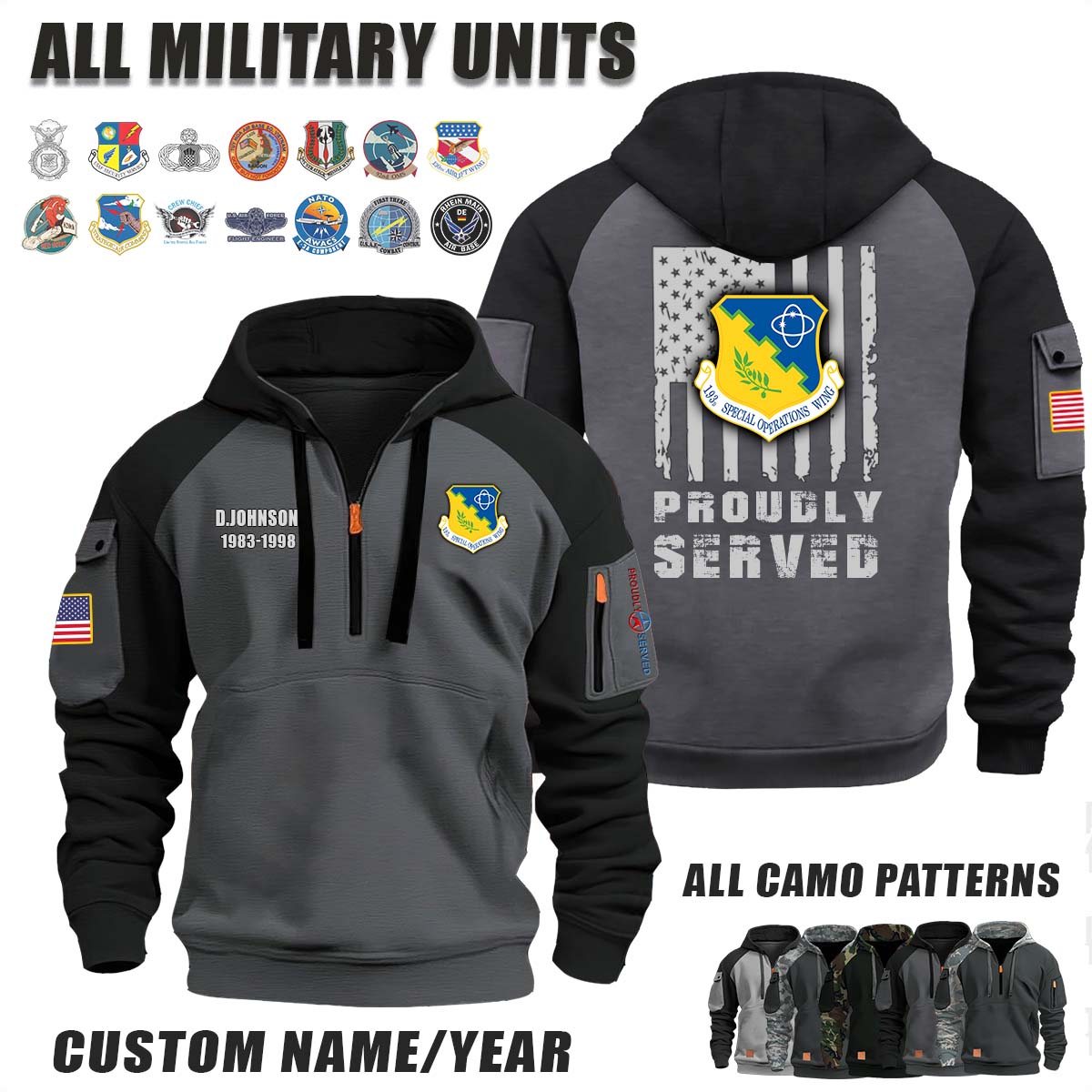 This 193rd SOW 193rd Special Operations Wing, ANG_Camo Halfzip Hoodie lets you customize your Branch, Unit, Role, Rank, and Years Served — so your service, sacrifice, and pride live on.