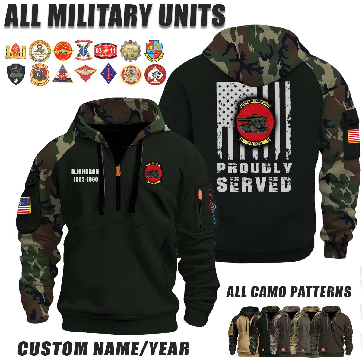 This 1st Anti-Tank Battalion_Camo Halfzip Hoodie lets you customize your Branch, Unit, Role, Rank, and Years Served — so your service, sacrifice, and pride live on.