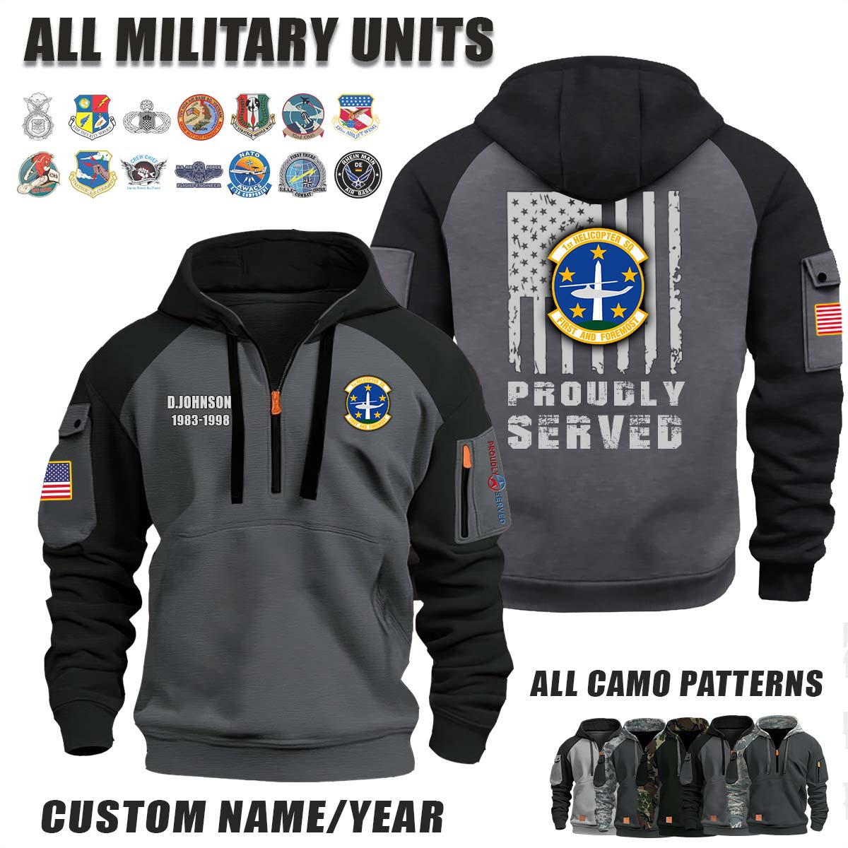 This 1st Helicopter Squadron_Camo Halfzip Hoodie lets you customize your Branch, Unit, Role, Rank, and Years Served — so your service, sacrifice, and pride live on.