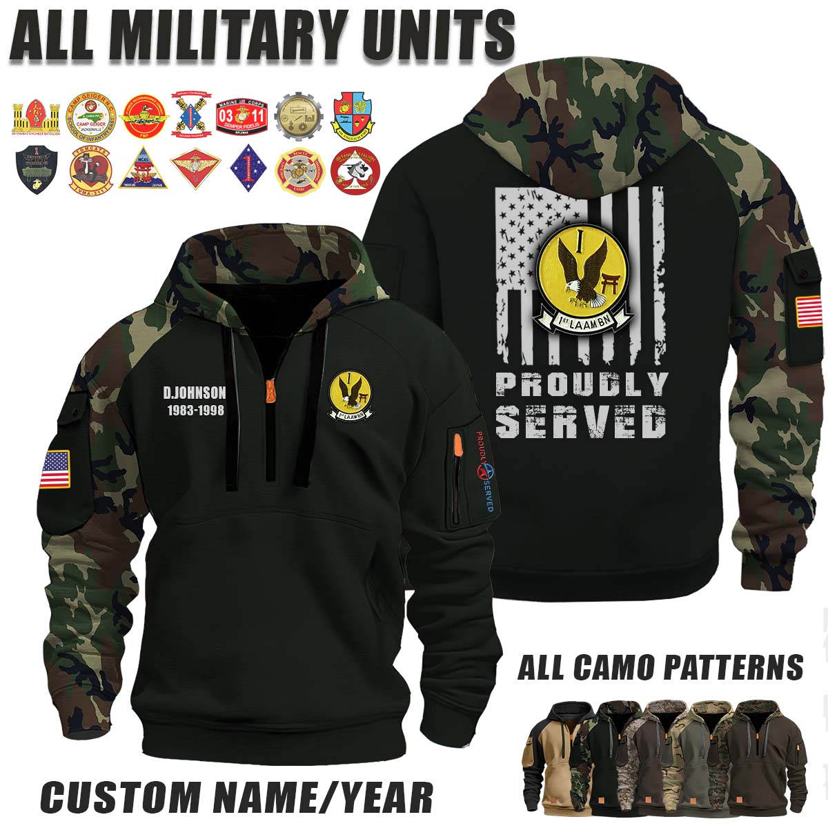 This 1st LAAM Bn 1st Light Antiaircraft Missile Battalion_Camo Halfzip Hoodie lets you customize your Branch, Unit, Role, Rank, and Years Served — so your service, sacrifice, and pride live on.