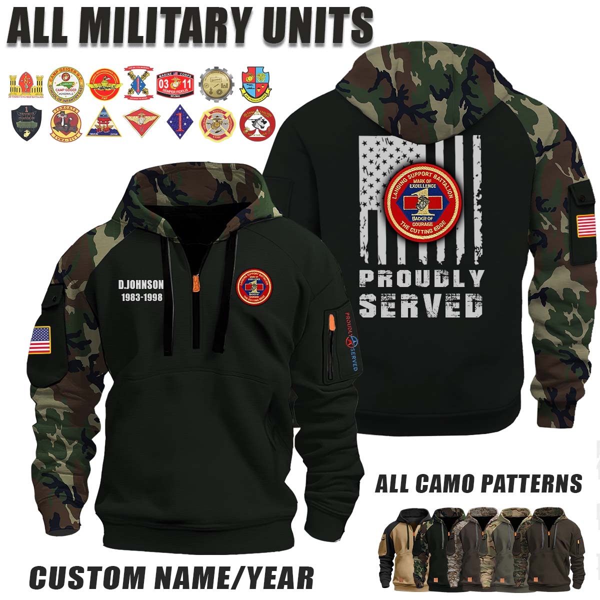 This 1st LSB 1st Landing Support Battalion_Camo Halfzip Hoodie lets you customize your Branch, Unit, Role, Rank, and Years Served — so your service, sacrifice, and pride live on.