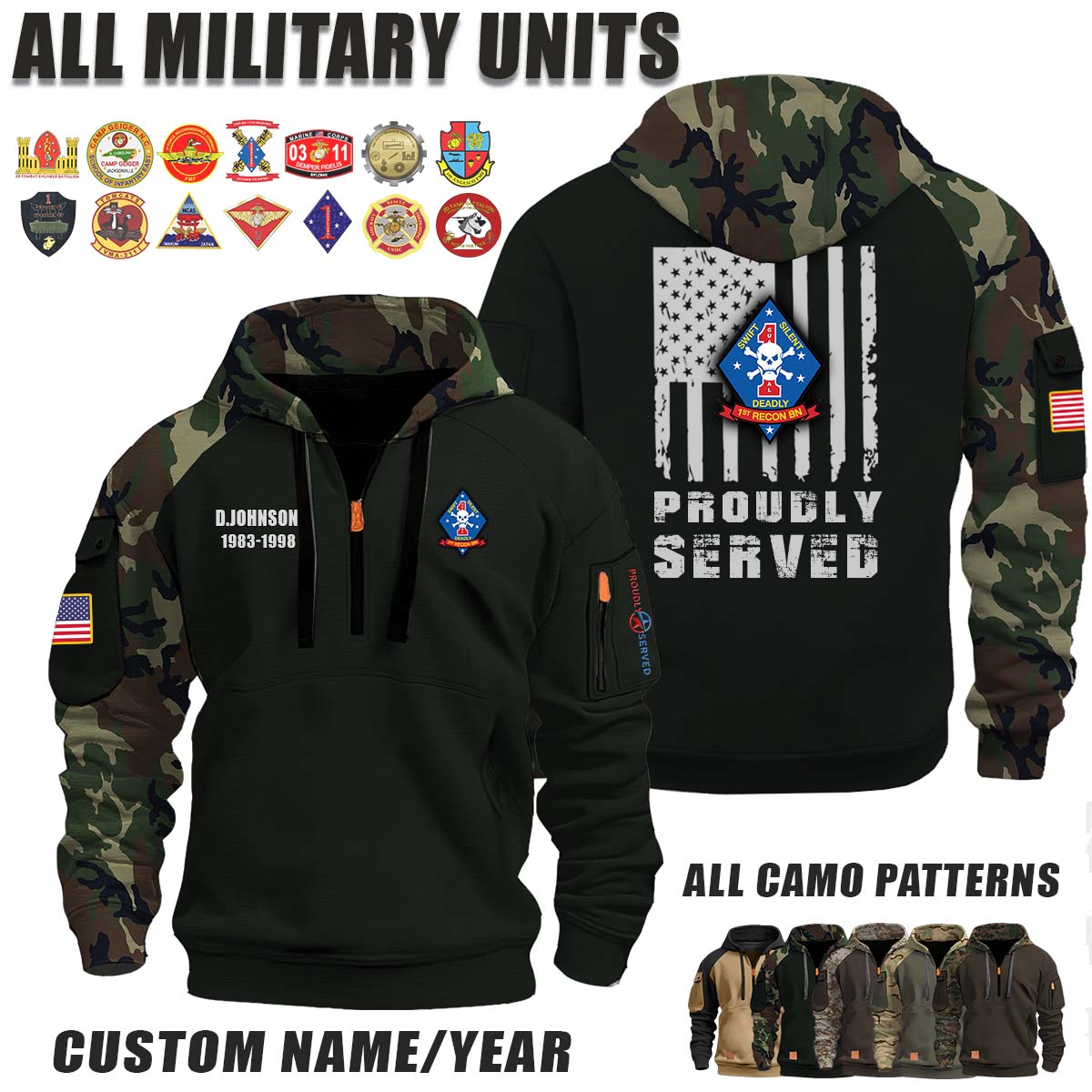 This 1st Recon Bn 1st Reconnaissance Battalion_Camo Halfzip Hoodie lets you customize your Branch, Unit, Role, Rank, and Years Served — so your service, sacrifice, and pride live on.