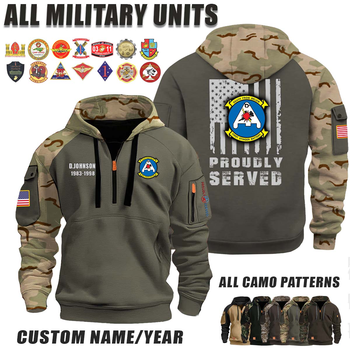 This 1st Stinger Battery_Camo Halfzip Hoodie lets you customize your Branch, Unit, Role, Rank, and Years Served — so your service, sacrifice, and pride live on.