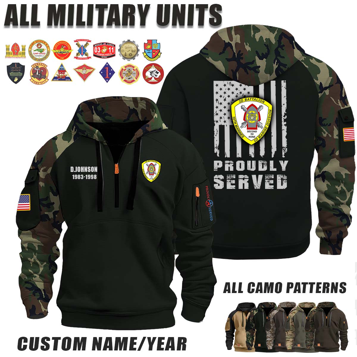 This 2-10 Marines 2nd Battalion 10th Marines_Camo Halfzip Hoodie lets you customize your Branch, Unit, Role, Rank, and Years Served — so your service, sacrifice, and pride live on.