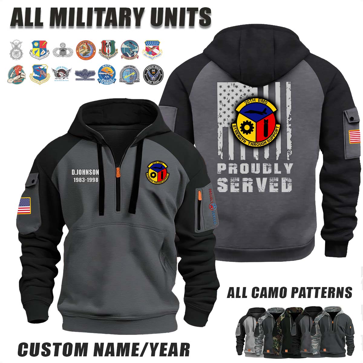 This 20th EMS Equipment Maintenance Squadron_Camo Halfzip Hoodie lets you customize your Branch, Unit, Role, Rank, and Years Served — so your service, sacrifice, and pride live on.