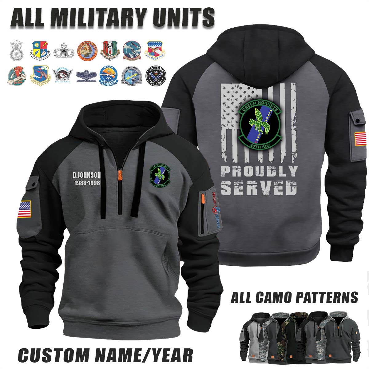 This 20th SOS Special Operations Squadron_Camo Halfzip Hoodie lets you customize your Branch, Unit, Role, Rank, and Years Served — so your service, sacrifice, and pride live on.