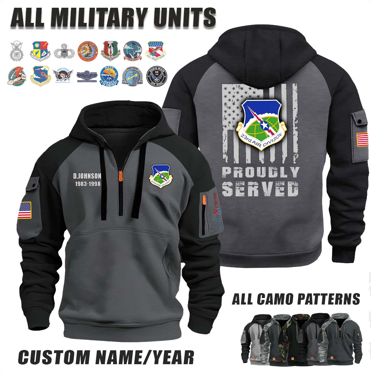 This 23rd Air Division_Camo Halfzip Hoodie lets you customize your Branch, Unit, Role, Rank, and Years Served — so your service, sacrifice, and pride live on.
