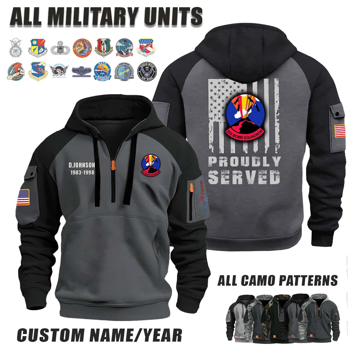 This 23rd BS Bomb Squadron_Camo Halfzip Hoodie lets you customize your Branch, Unit, Role, Rank, and Years Served — so your service, sacrifice, and pride live on.