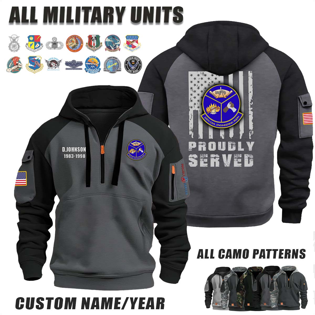 This 24th CES Civil Engineering Squadron_Camo Halfzip Hoodie lets you customize your Branch, Unit, Role, Rank, and Years Served — so your service, sacrifice, and pride live on.