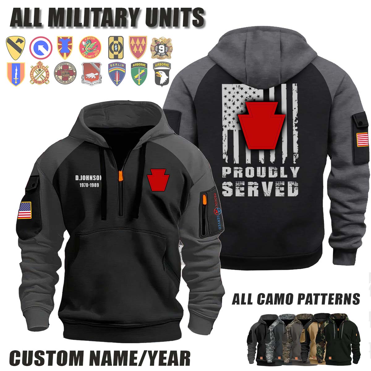 This 28th ID 28th Infantry Division_Camo Halfzip Hoodie lets you customize your Branch, Unit, Role, Rank, and Years Served — so your service, sacrifice, and pride live on.