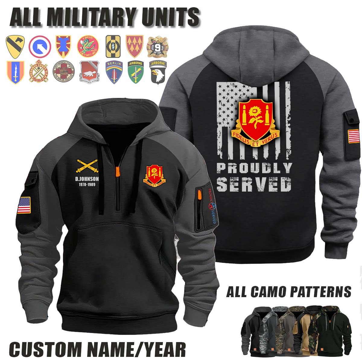This 29th FA 29th Field Artillery Regiment_Camo Halfzip Hoodie lets you customize your Branch, Unit, Role, Rank, and Years Served — so your service, sacrifice, and pride live on.
