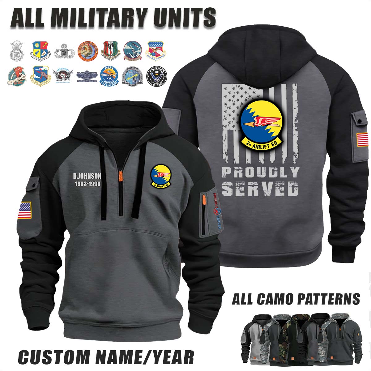 This 2d AS Airlift Squadron_Camo Halfzip Hoodie lets you customize your Branch, Unit, Role, Rank, and Years Served — so your service, sacrifice, and pride live on.