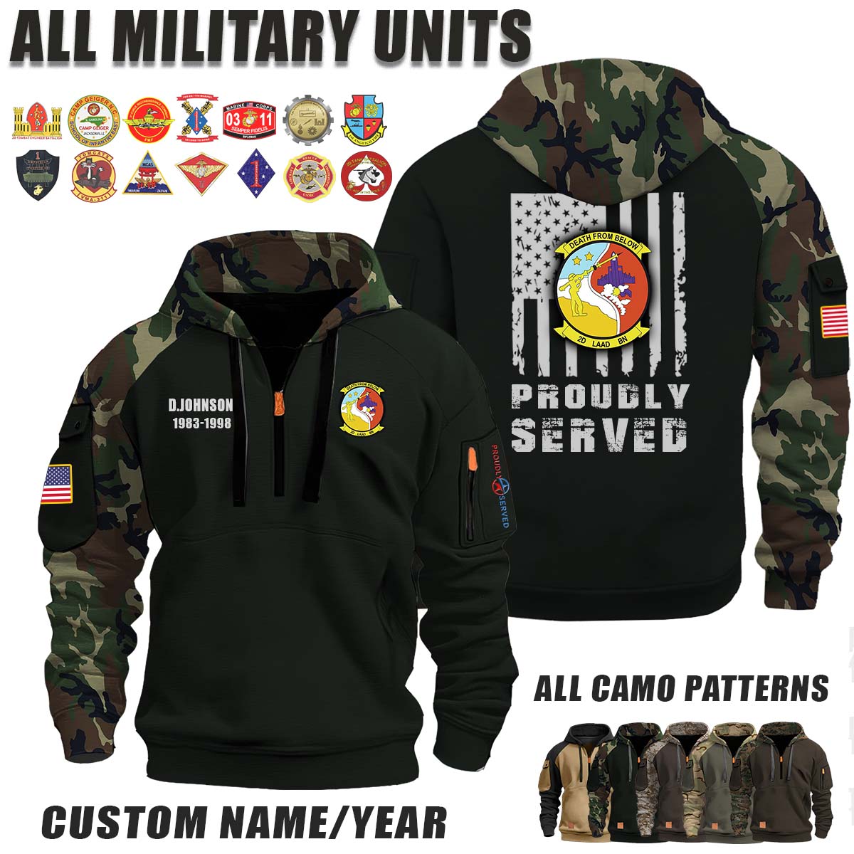This 2d LAAD 2d Low Altitude Air Defense Battalion_Camo Halfzip Hoodie lets you customize your Branch, Unit, Role, Rank, and Years Served — so your service, sacrifice, and pride live on.