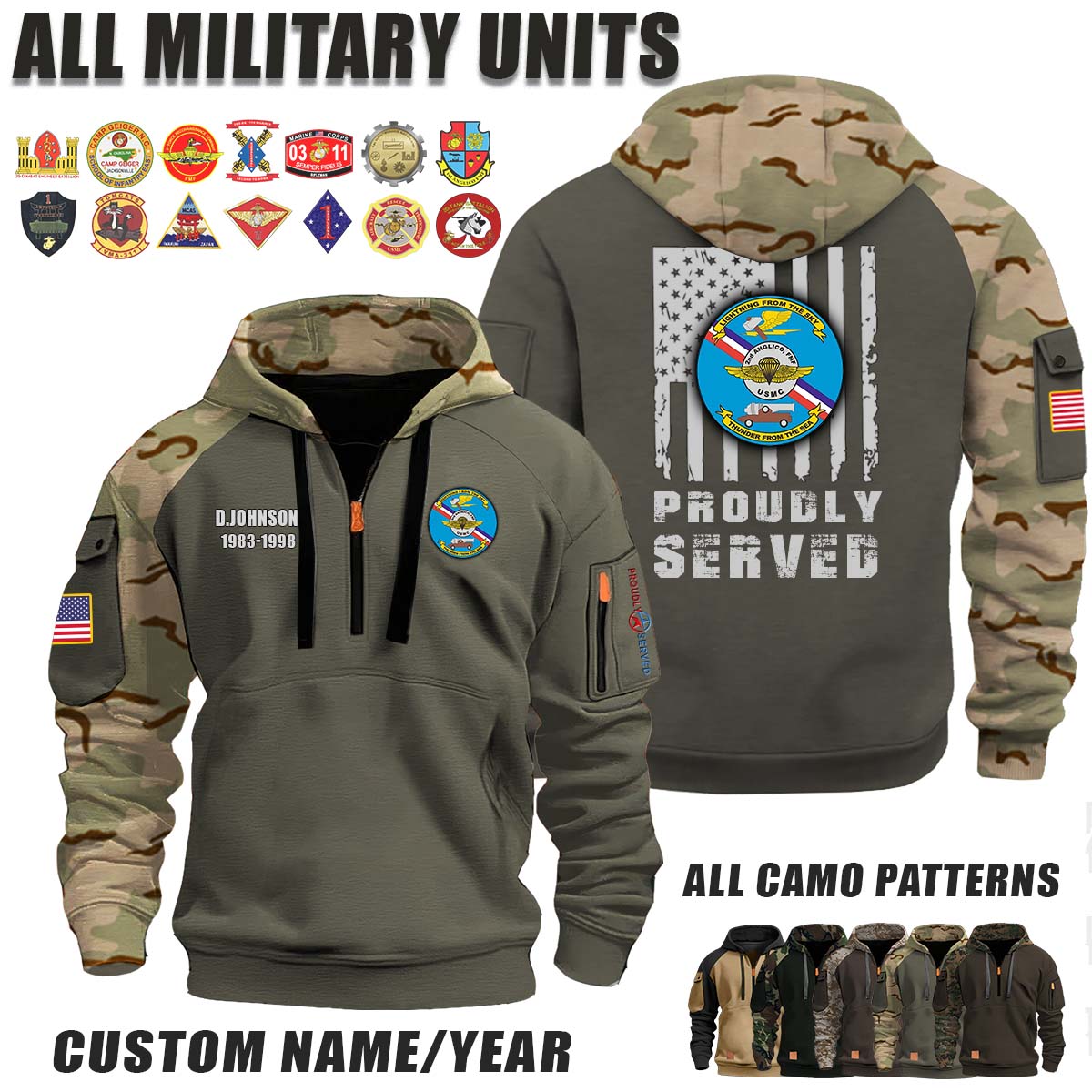 This 2nd ANGLICO 2nd Air Naval Gunfire Liaison Company_Camo Halfzip Hoodie lets you customize your Branch, Unit, Role, Rank, and Years Served — so your service, sacrifice, and pride live on.