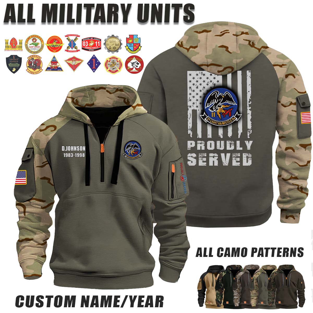 This 2nd LAAM Bn 2nd Light Antiaircraft Missile Battalion_Camo Halfzip Hoodie lets you customize your Branch, Unit, Role, Rank, and Years Served — so your service, sacrifice, and pride live on.