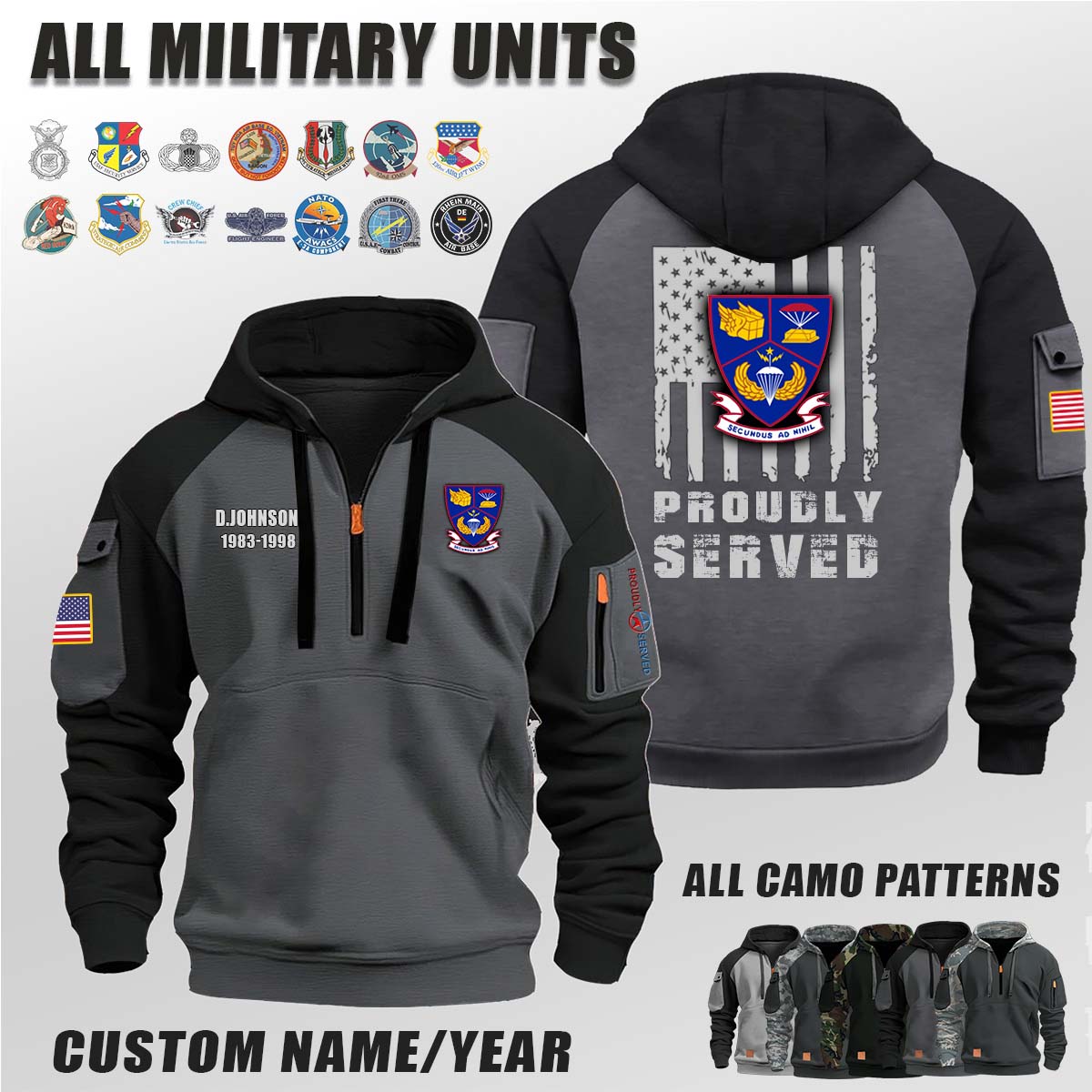 This 2nd MAPS Mobile Aerial Port Squadron_Camo Halfzip Hoodie lets you customize your Branch, Unit, Role, Rank, and Years Served — so your service, sacrifice, and pride live on.