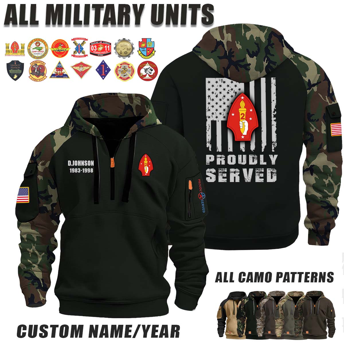 This 2nd MARDIV 2nd Marine Division_Camo Halfzip Hoodie lets you customize your Branch, Unit, Role, Rank, and Years Served — so your service, sacrifice, and pride live on.