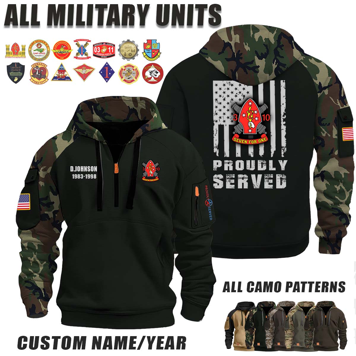 This 3-10 Marines 3rd Battalion 10th Marines_Camo Halfzip Hoodie lets you customize your Branch, Unit, Role, Rank, and Years Served — so your service, sacrifice, and pride live on.