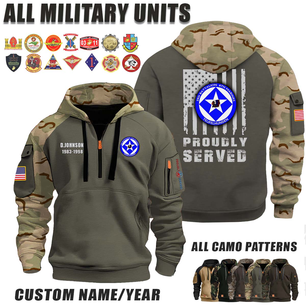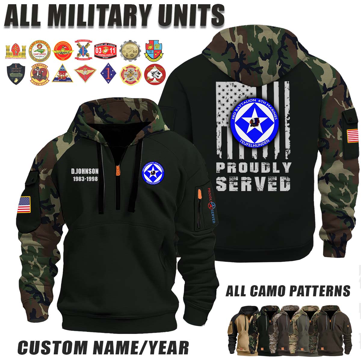 This 3-6 Marines 3rd Battalion 6th Marines_Camo Halfzip Hoodie lets you customize your Branch, Unit, Role, Rank, and Years Served — so your service, sacrifice, and pride live on.