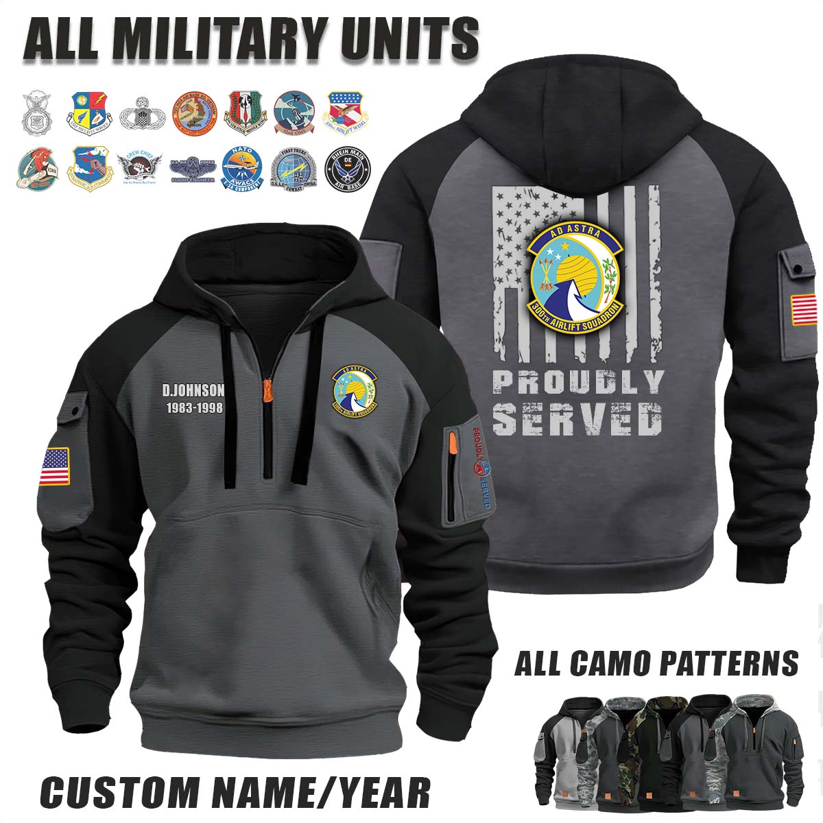 This 300th AS Airlift Squadron_Camo Halfzip Hoodie lets you customize your Branch, Unit, Role, Rank, and Years Served — so your service, sacrifice, and pride live on.