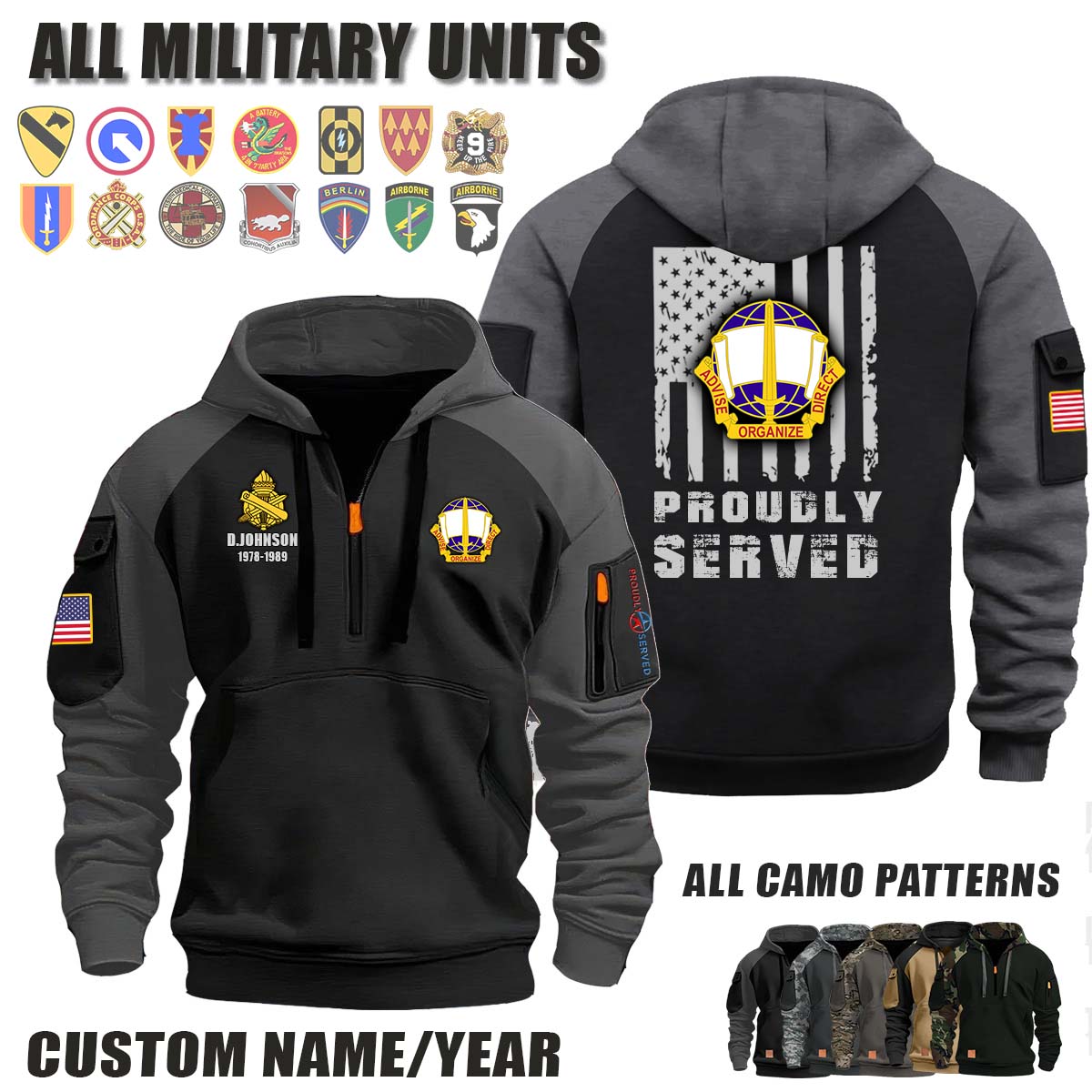 This 308th CA BDE 308th Civil Affairs Brigade_Camo Halfzip Hoodie lets you customize your Branch, Unit, Role, Rank, and Years Served — so your service, sacrifice, and pride live on.
