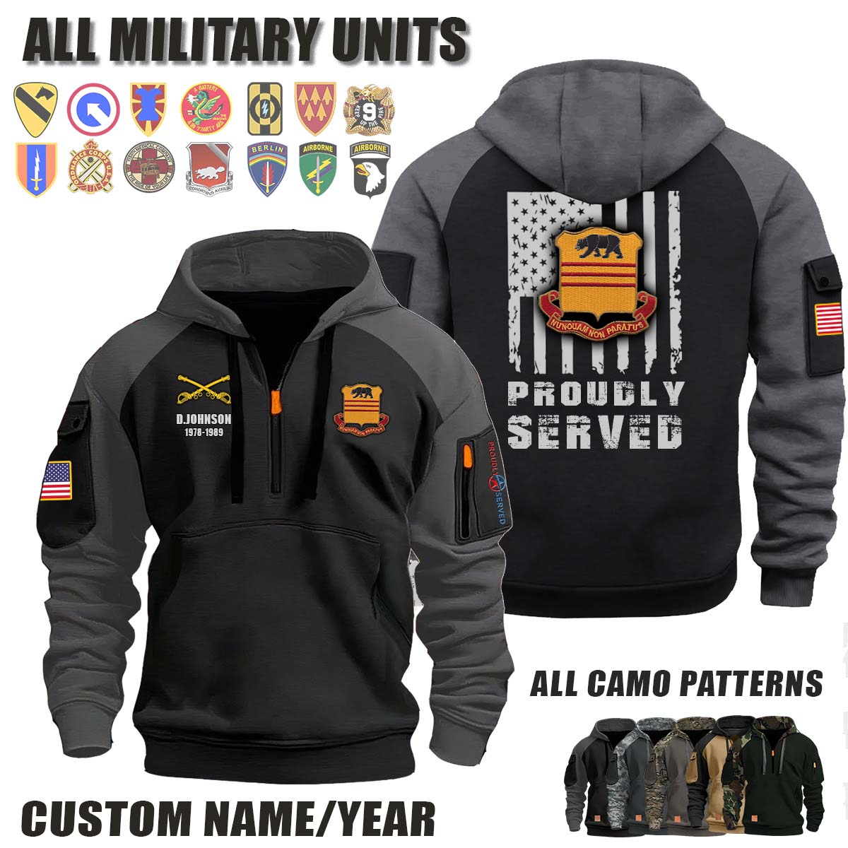 This 308th Cavalry Regiment_Camo Halfzip Hoodie lets you customize your Branch, Unit, Role, Rank, and Years Served — so your service, sacrifice, and pride live on.