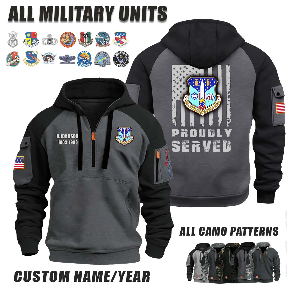 This 308th SMW Strategic Missile Wing_Camo Halfzip Hoodie lets you customize your Branch, Unit, Role, Rank, and Years Served — so your service, sacrifice, and pride live on.
