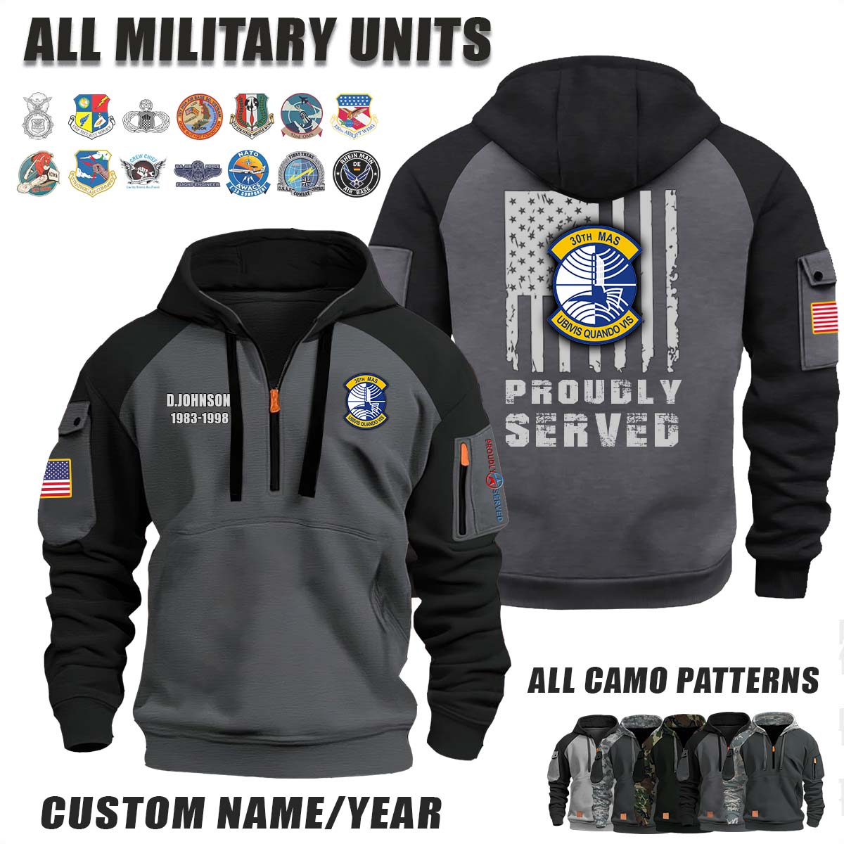 This 30th MAS Military Airlift Squadron_Camo Halfzip Hoodie lets you customize your Branch, Unit, Role, Rank, and Years Served — so your service, sacrifice, and pride live on.