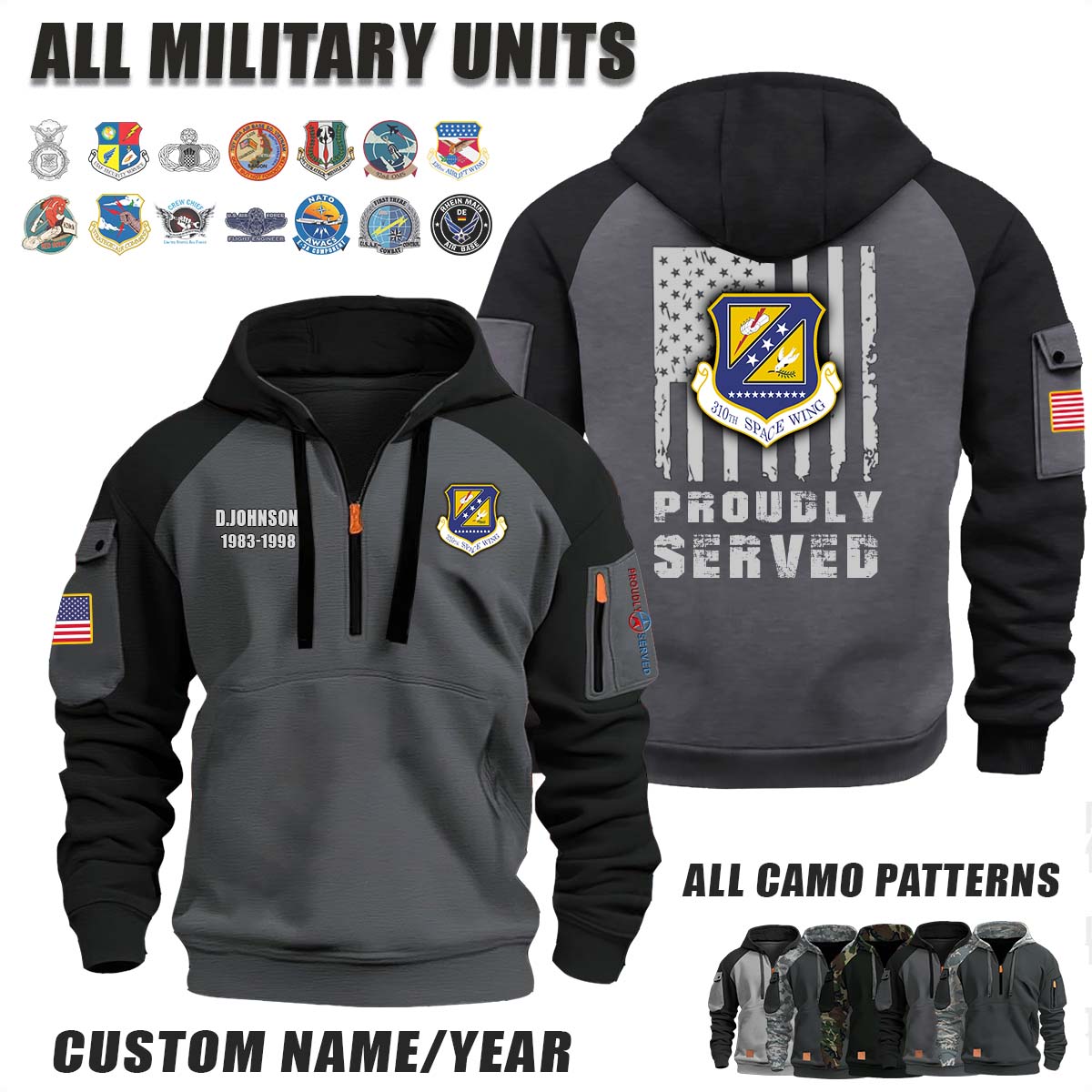 This 310th SW Space Wing_Camo Halfzip Hoodie lets you customize your Branch, Unit, Role, Rank, and Years Served — so your service, sacrifice, and pride live on.