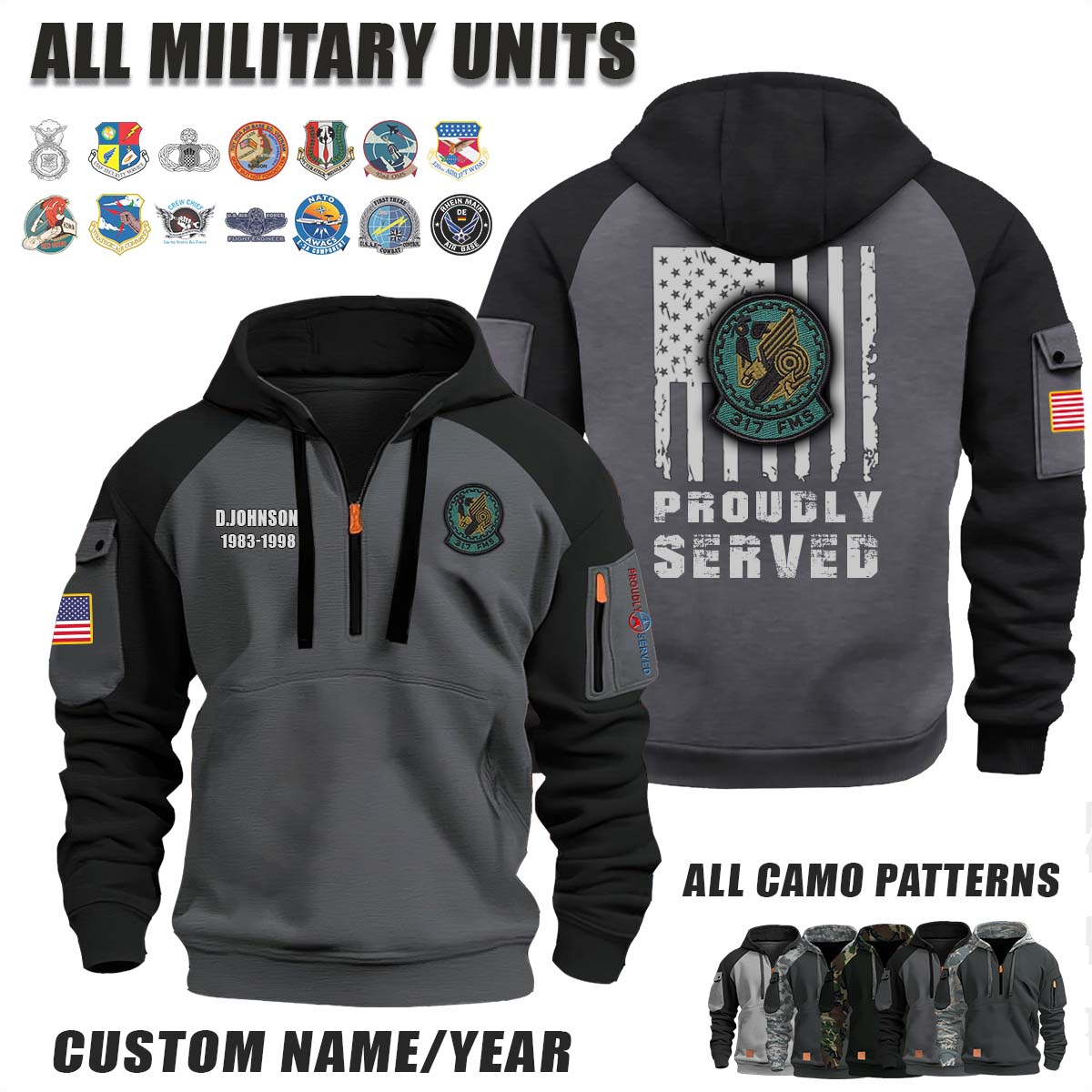 This 317th FMS Field Maintenance Squadron_Camo Halfzip Hoodie lets you customize your Branch, Unit, Role, Rank, and Years Served — so your service, sacrifice, and pride live on.
