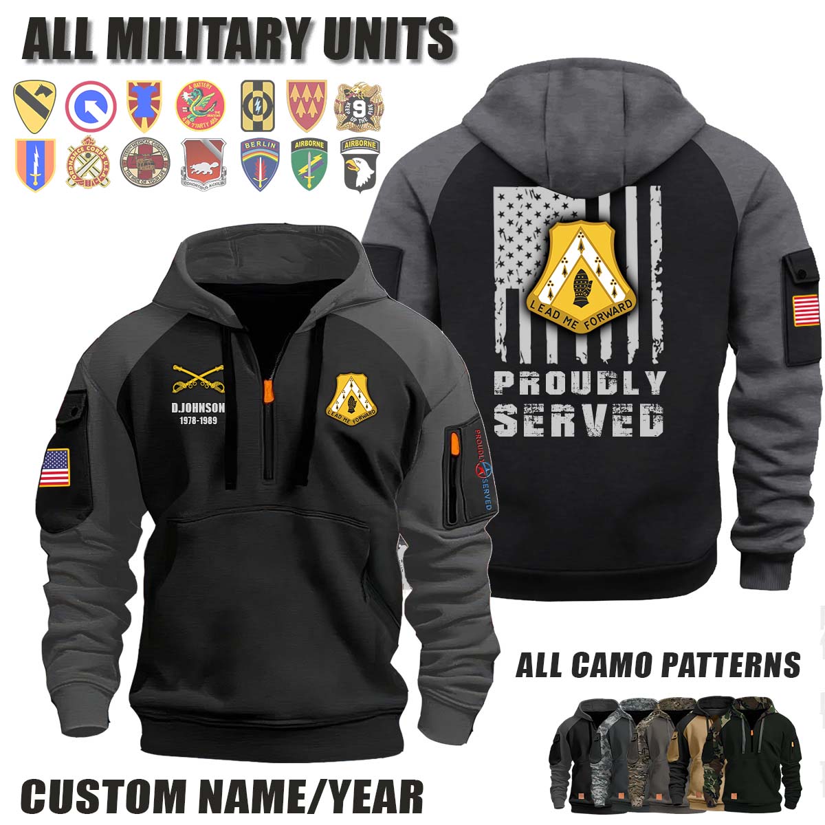This 319th Cavalry Regiment_Camo Halfzip Hoodie lets you customize your Branch, Unit, Role, Rank, and Years Served — so your service, sacrifice, and pride live on.