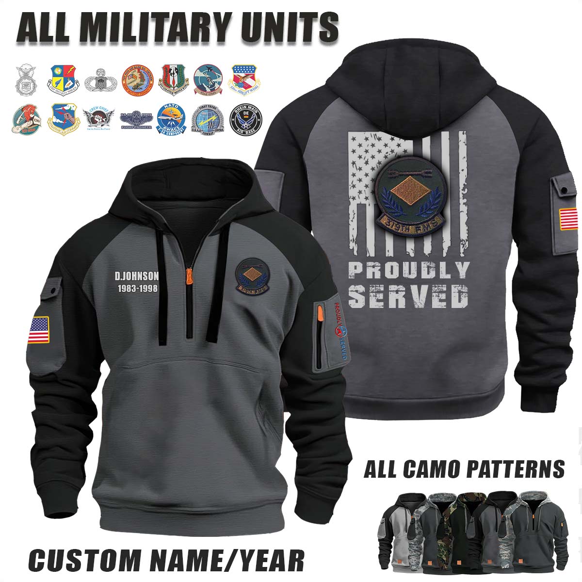 This 319th FMS Field Maintenance Squadron_Camo Halfzip Hoodie lets you customize your Branch, Unit, Role, Rank, and Years Served — so your service, sacrifice, and pride live on.