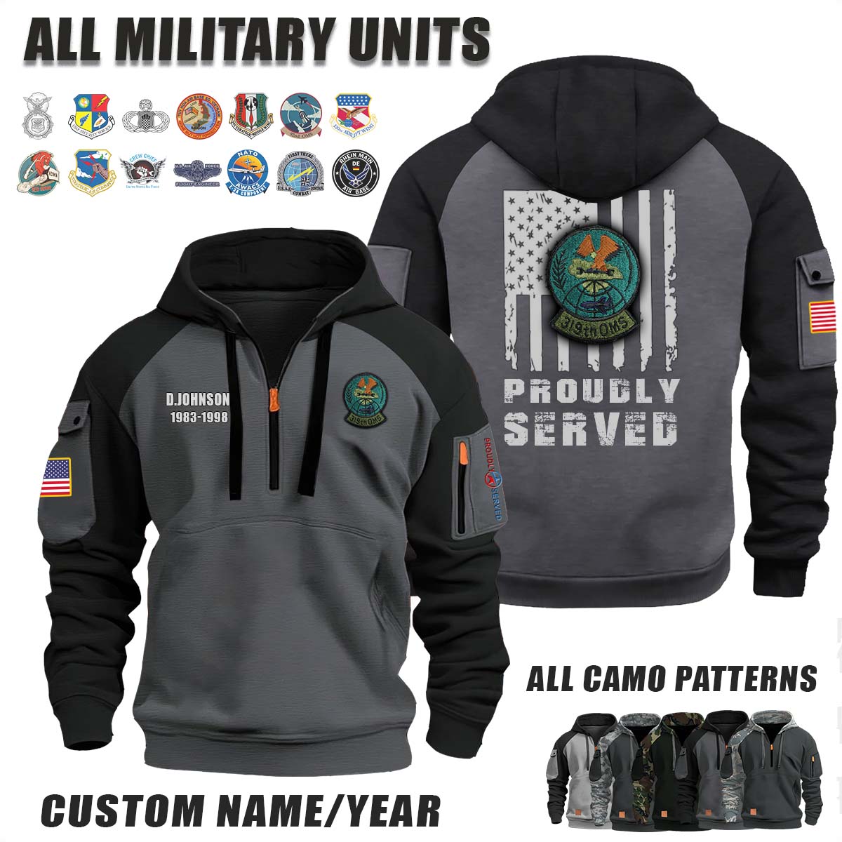 This 319th OMS 319th Organizational Maintenance Squadron_Camo Halfzip Hoodie lets you customize your Branch, Unit, Role, Rank, and Years Served — so your service, sacrifice, and pride live on.